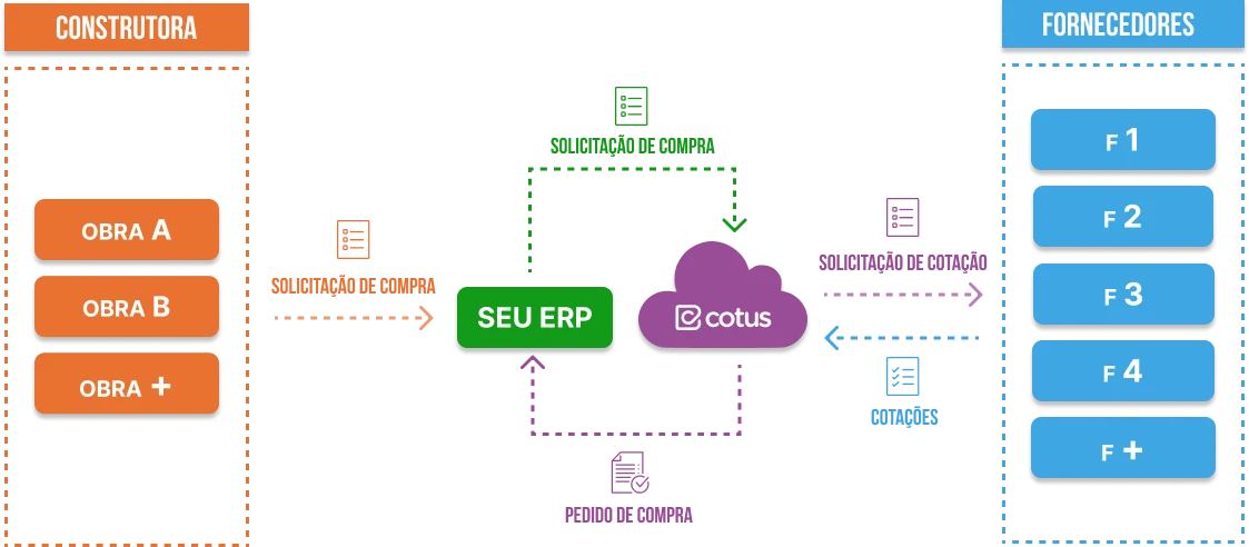 Independente que sua construtora seja PMG, se você faz uso, ou não, de um Software ERP, o Cotus te oferece uma nova experiência em economia de tempo, transparência e redução dos custos na aquisição de materiais e serviços. Nossa integração elimina o retrabalho, proporciona aprimorada eficiência na troca de informações entre plataformas e maximiza os seus resultados operacionais.